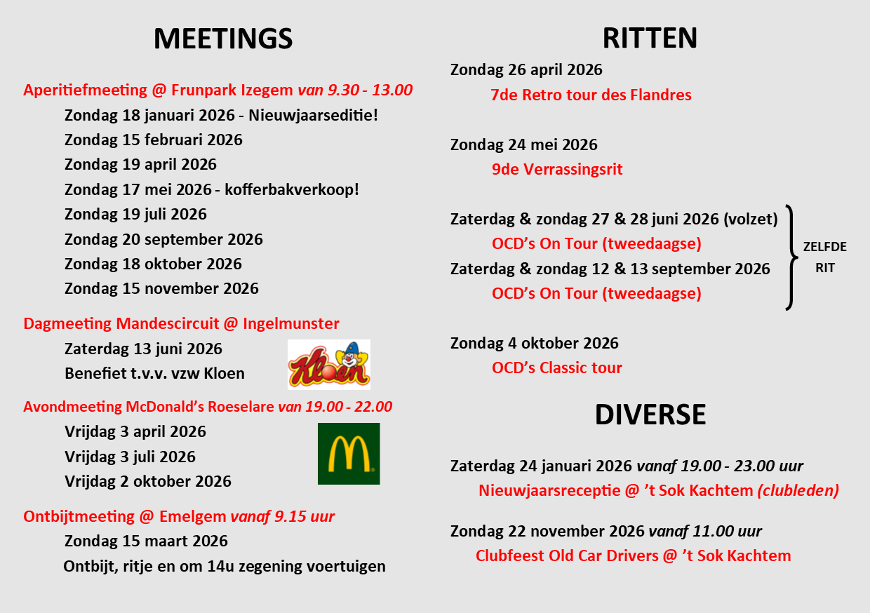 Wil je meerijden, naar een bijeenkomst komen of informatie uitwisselen over jouw oldtimer, bekijk dan zeker de geplande activiteiten en schrijf je vandaag nog in.